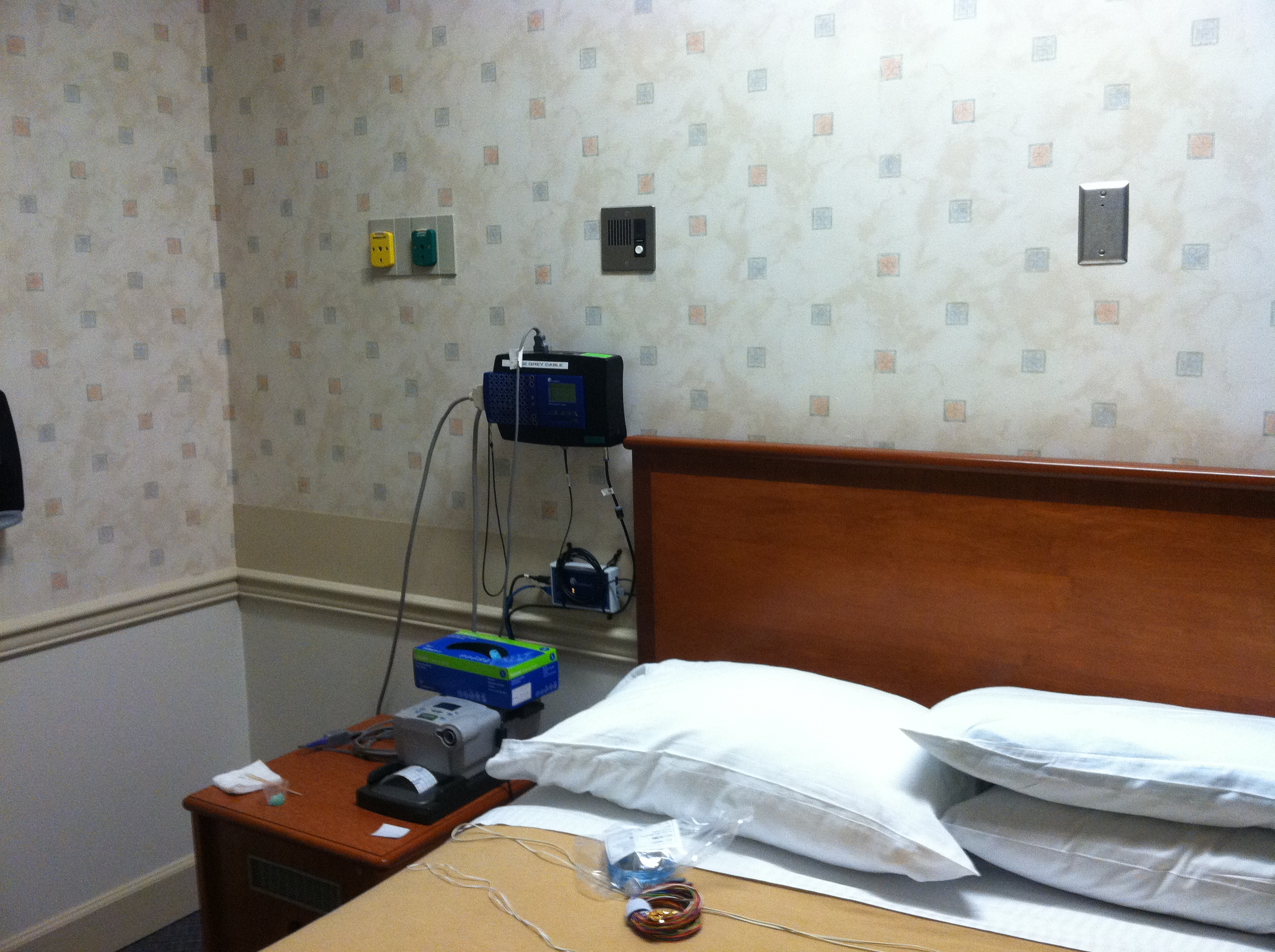 Once everything was set up, I didn’t have as much trouble falling asleep as I had anticipated. However, I definitely felt like I woke up more during the night than usual. I was awake a few times coughing, because my throat felt really dry, possibly the air in the room was dry. I would try to flip over and get tangled a little and I think that woke me up, where in my normal bed I can roll over without waking up. Also, I really should have brought my own pillow. I’m a princess and the pea type and can be very particular. The walls of the rooms were not thick enough and I could hear the technician setting up the patient in the next room. Light from the hallway came in through the crack under the door and there was light from some of the monitors. I sleep best in a complete blackout darkness situation, but I don’t like those eye masks.